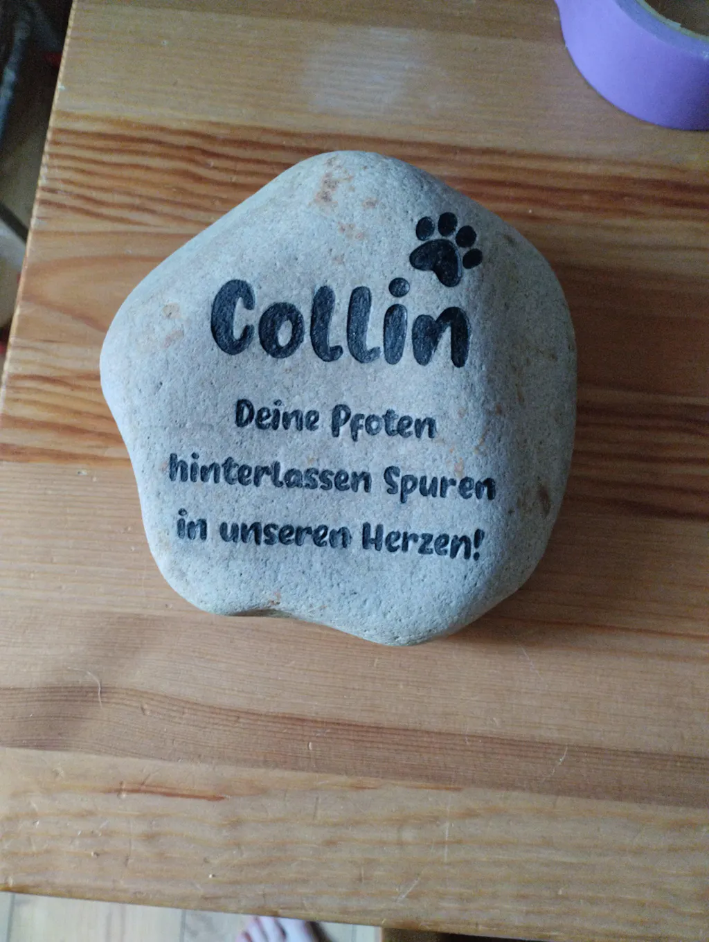 Wir haben diesen Stein für unseren kürzlich verstorbenen Hund gekauft. Mit einer tollen Gravur liegt er nun in unserem Garten unter einer Eibe. Wir bedanken uns für das tolle Stück Natur.